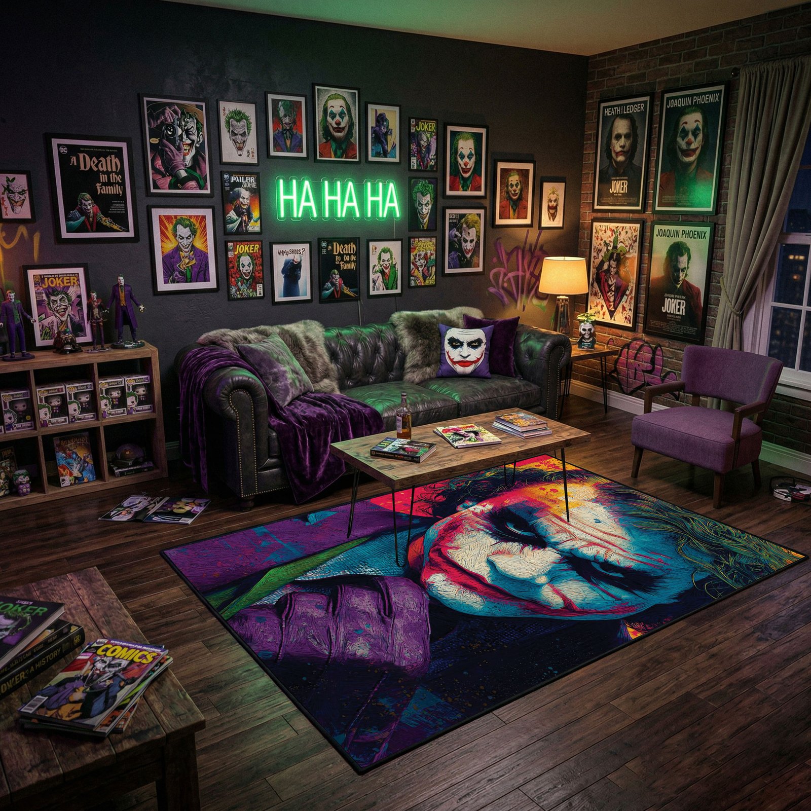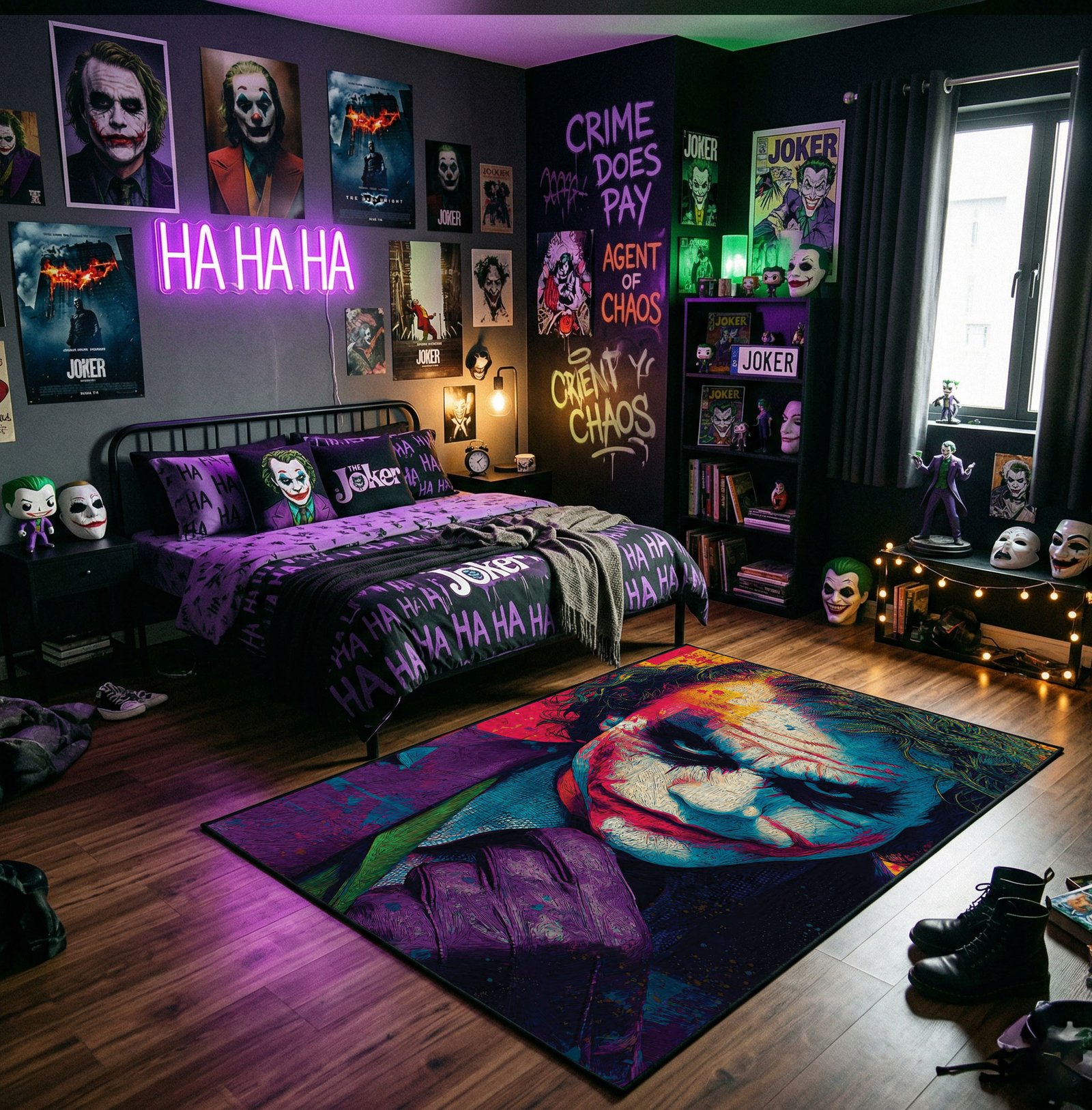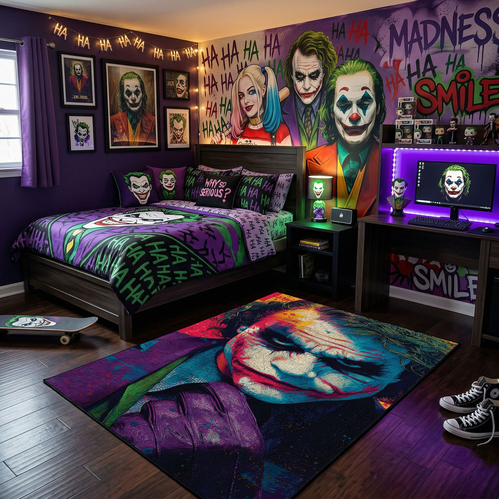 Transform your living space with a bold touch of chaos and iconic style. The Joker Area Rug is more than just décor—it’s a tribute to one of the most legendary and unpredictable characters in pop culture. Inspired by comic art and the Joker’s signature expressions, it captures a spirit of rebellion, dark humor, and strong individuality.