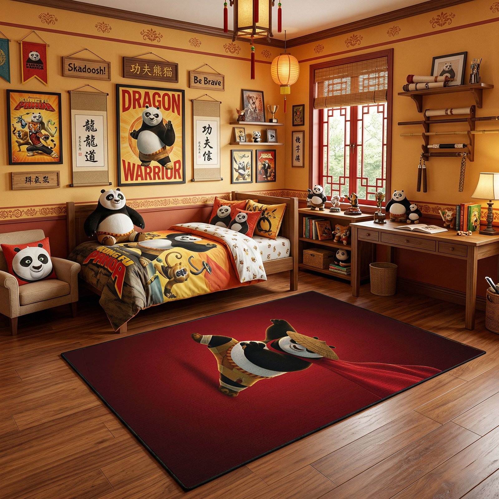Channel the ultimate mastery of Po with this striking Dragon Warrior area rug, featuring his iconic heroic pose against a bold crimson backdrop.