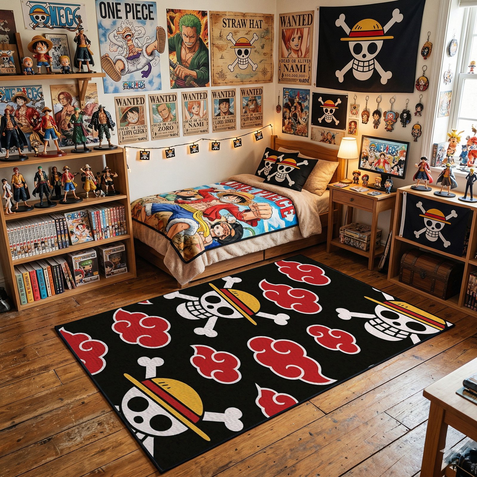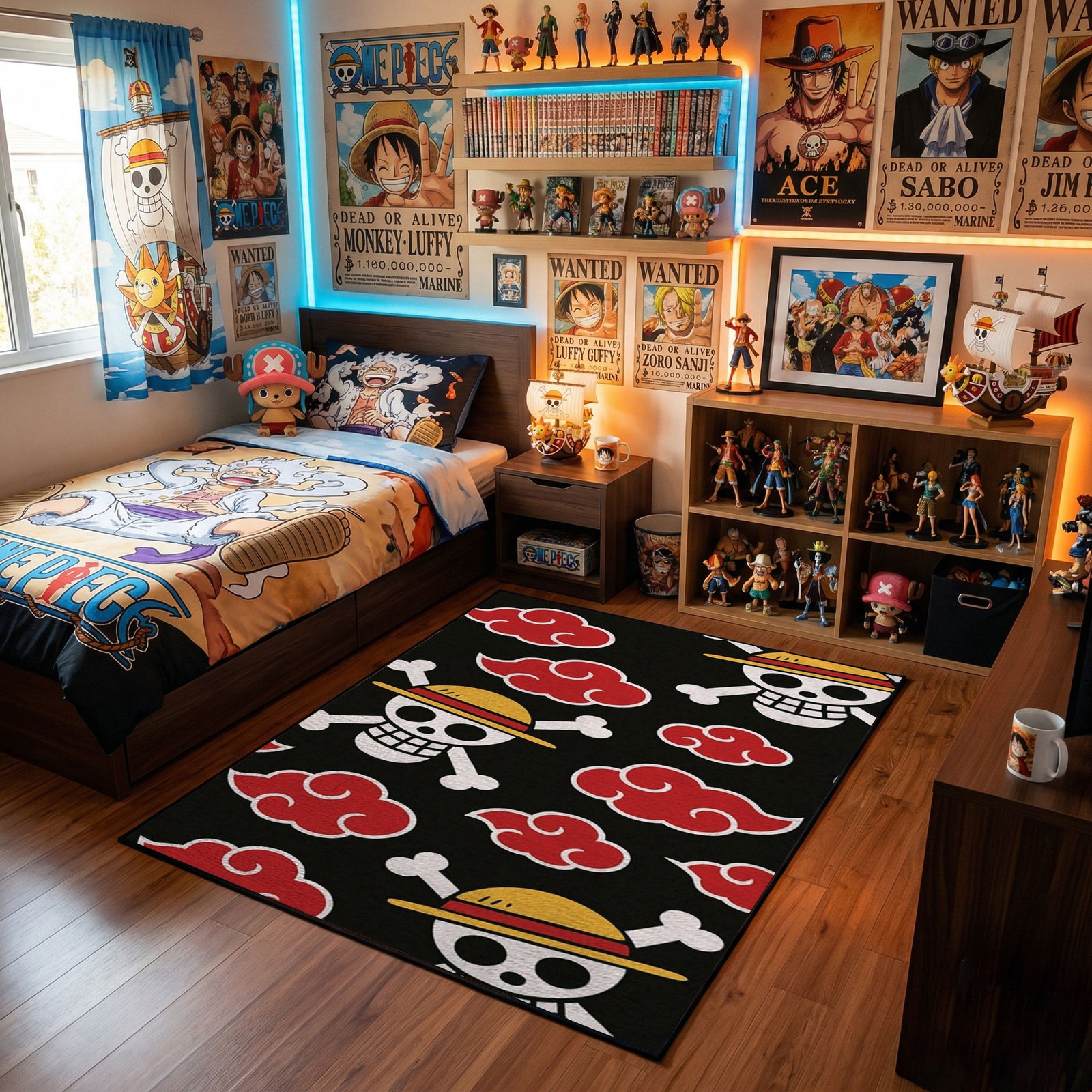 Transform your sanctuary with the One Piece x Naruto Akatsuki Crossover Area Rug. Featuring a bold mashup of the Straw Hat Jolly Roger and legendary red clouds, this high-definition piece is a true fan statement. Crafted from ultra-soft polyester with a non-slip backing for premium comfort and style.