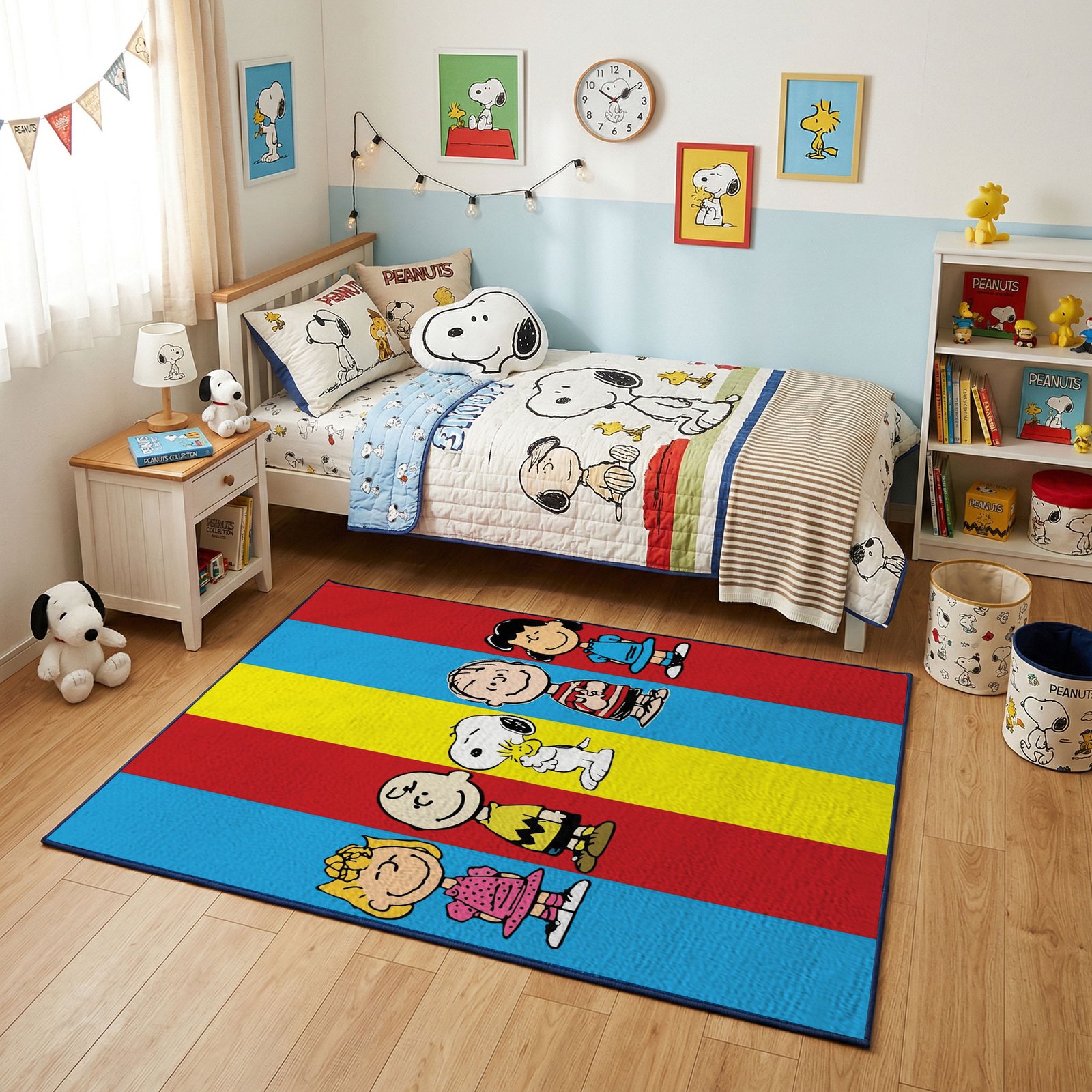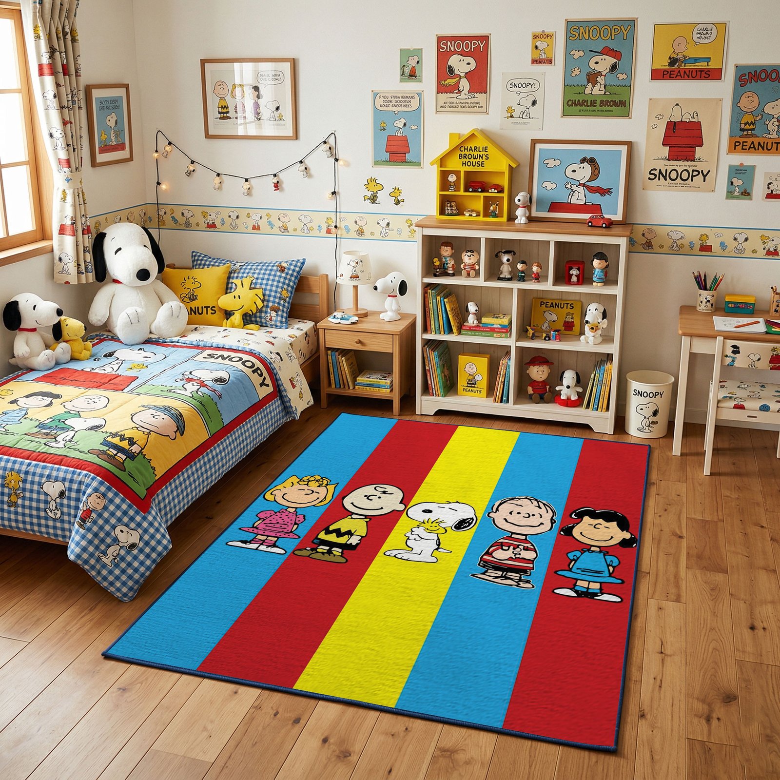 Bring the iconic Peanuts gang to your sanctuary with this vibrant striped area rug. Featuring Snoopy, Charlie Brown, and friends on bold red, blue, and yellow panels, this high-definition piece is a true fan statement. Crafted from ultra-soft polyester with a non-slip backing for premium comfort and timeless style.