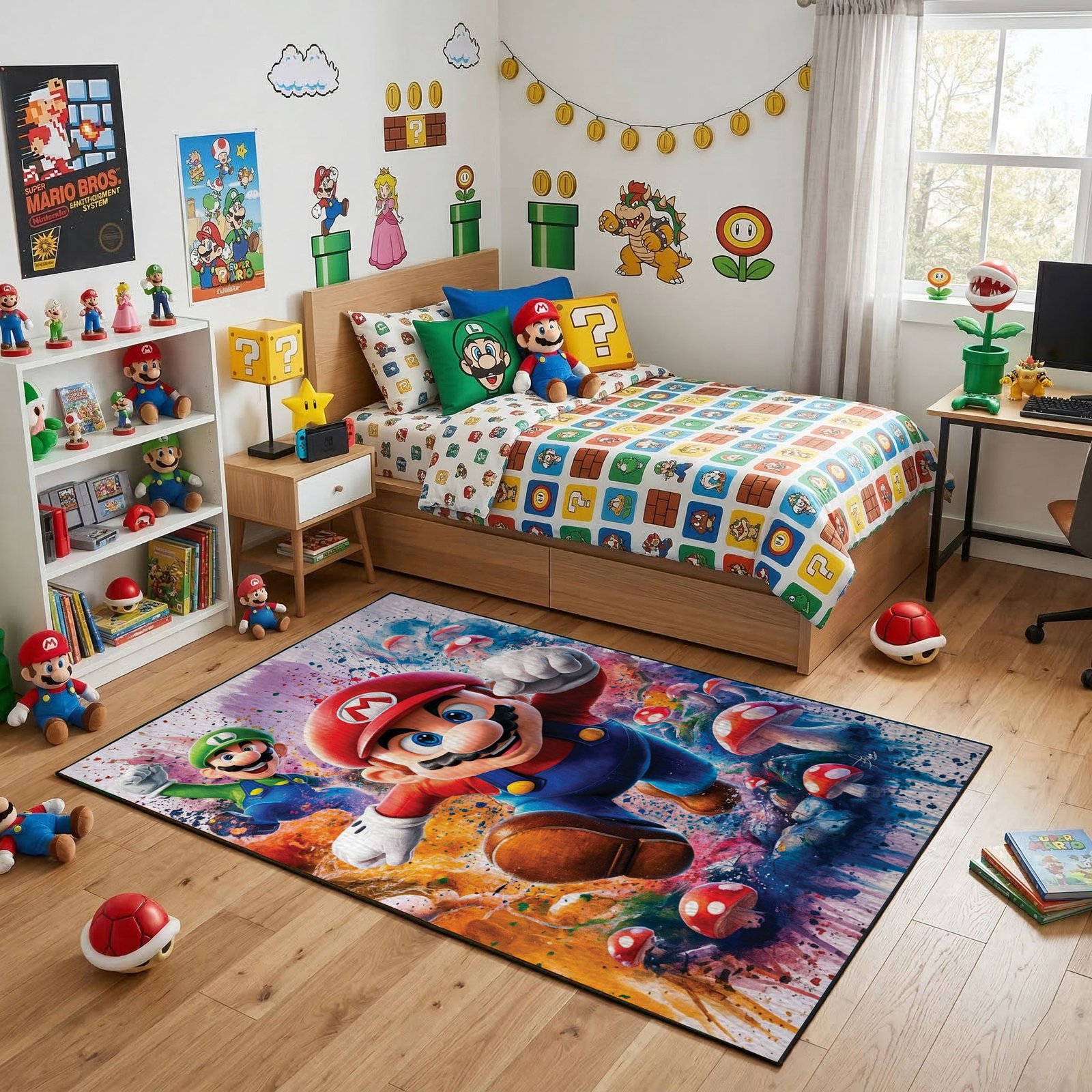 This Super Mario rug features a vibrant splash art design showcasing Mario and Luigi in an energetic action scene that instantly captures the spirit of classic video games. The colorful paint explosion background adds dynamic visual movement, turning the rug into a striking centerpiece for any gamer bedroom or playroom. The bold character artwork creates a nostalgic gaming atmosphere that fans of retro video games instantly recognize. Whether placed in a gaming setup, bedroom, or entertainment room, this rug adds personality, excitement, and iconic gaming culture to your space.Perfect Rug for Gamer Bedrooms and Gaming Setups