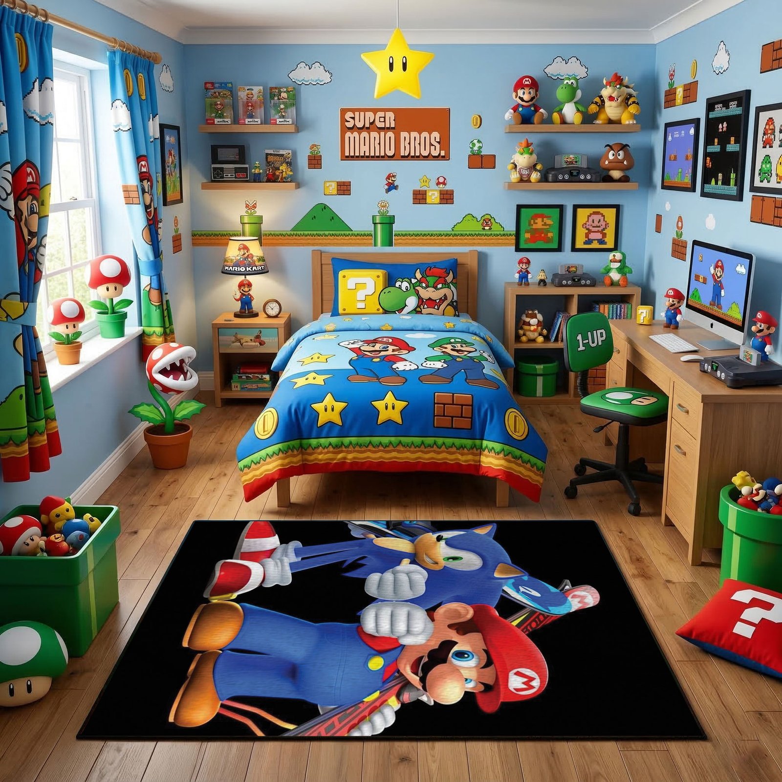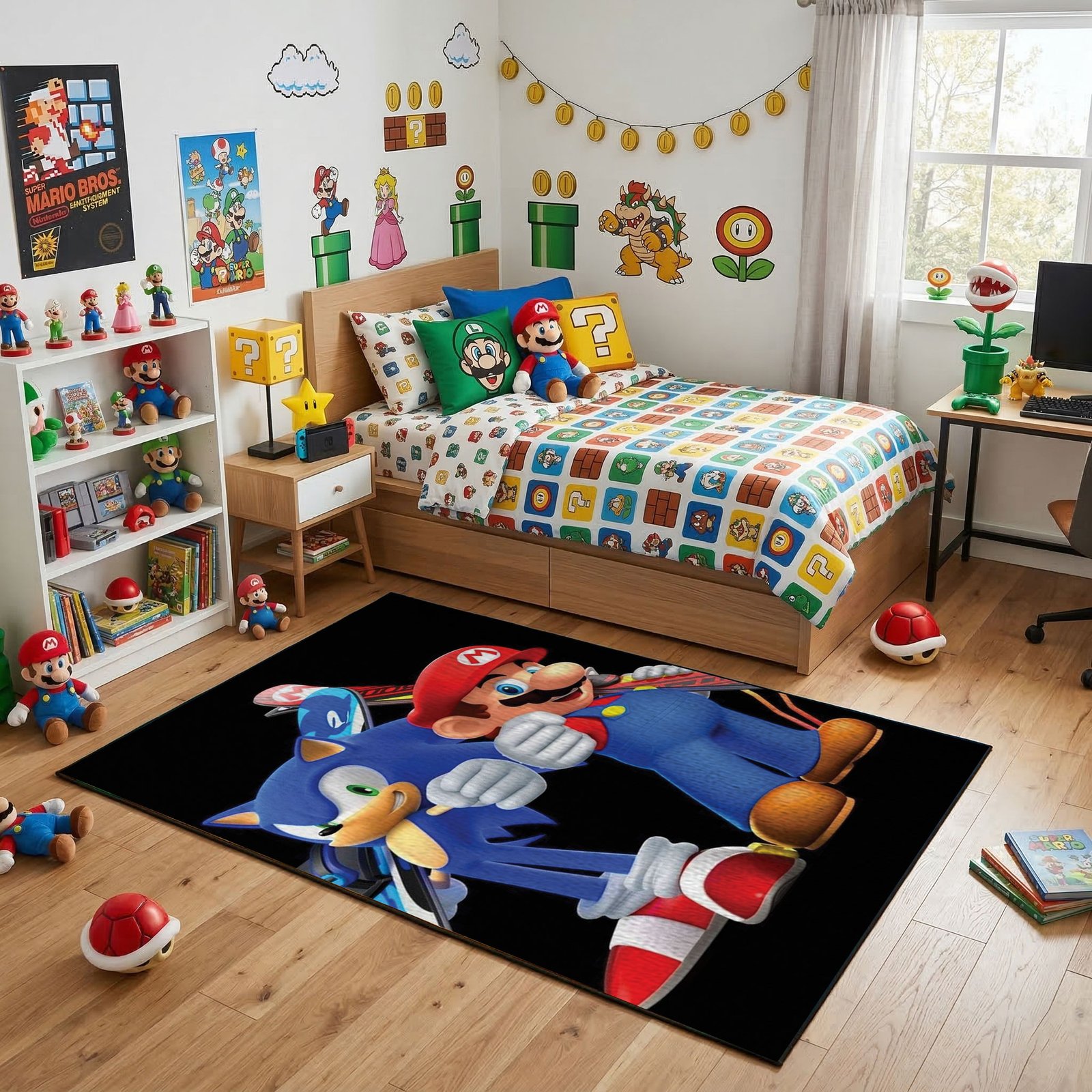 Super Mario Rug – Mario Sonic Gaming Area Rug – Nintendo Mario Room Decor – Retro Gaming Carpet