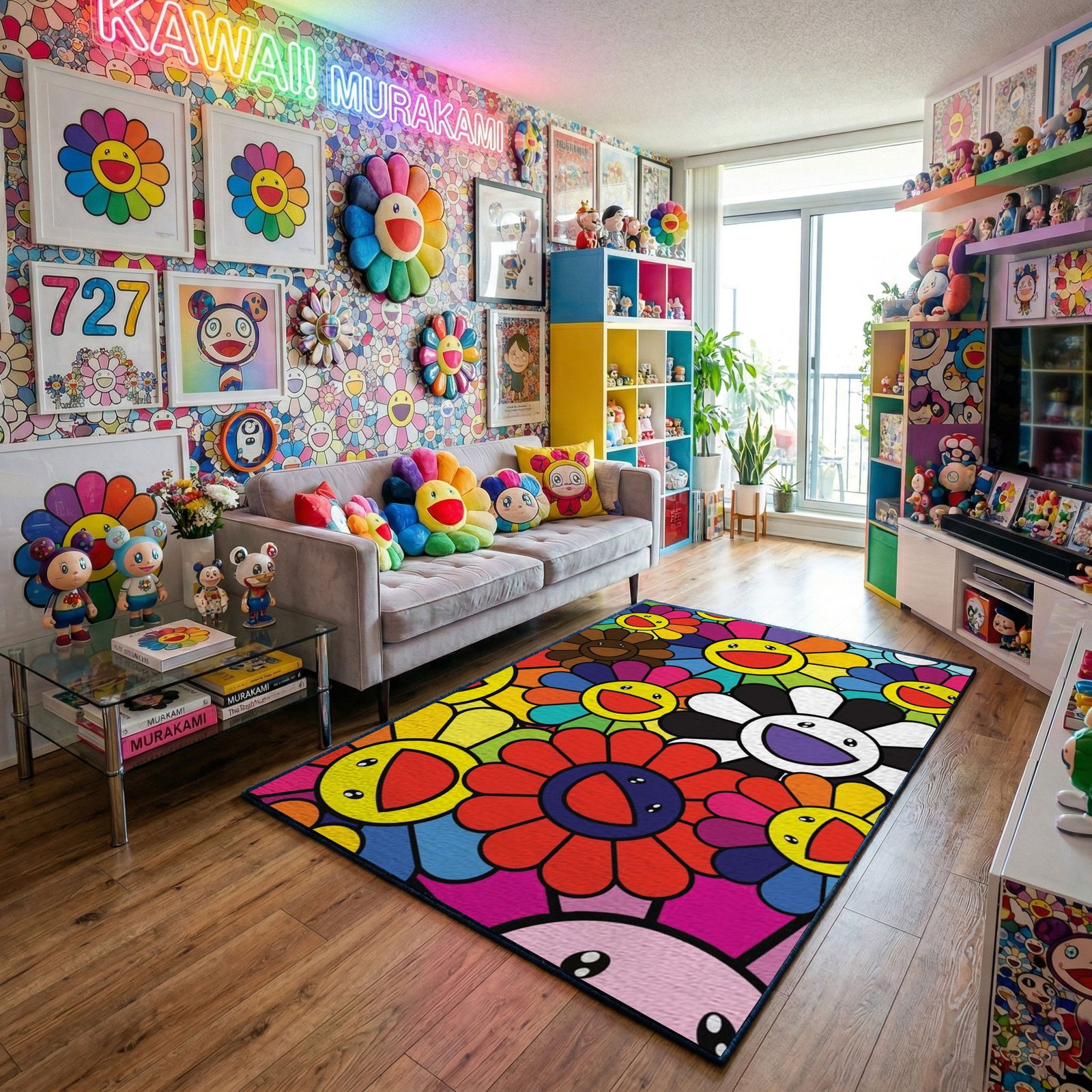 Takashi Murakami Inspired Grand Smiling Flower Collage Area Rug – Vibrant Superflat Pop Art, Modern Collector Bedroom & Living Room Floor Mat